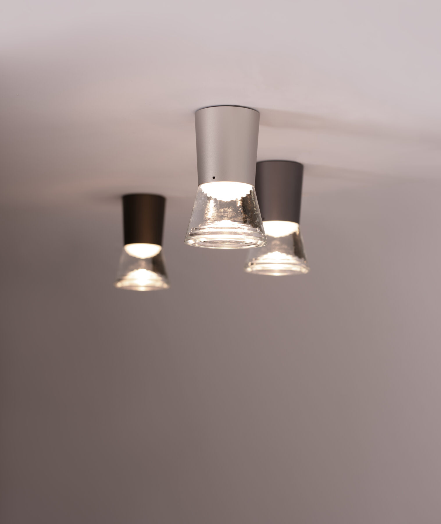 MOKA ist ein dekoratives Downlight mit hoher Lichtleistung und klarer Formensprache. Die Deckenleuchte verbindet funktionale Effizienz mit einer angenehmen Lichtwirkung und eignet sich für den Einsatz im Wohn-, Wellness- und Gastronomiebereich. Das konische Gussglas lenkt den Großteil des Lichts gezielt nach unten, während ein kleinerer Anteil zur Raumbeleuchtung beiträgt. Drei unterschiedliche Mattierungsvarianten ermöglichen differenzierte Lichtwirkungen – von organisch konzentrisch bis weich diffus.